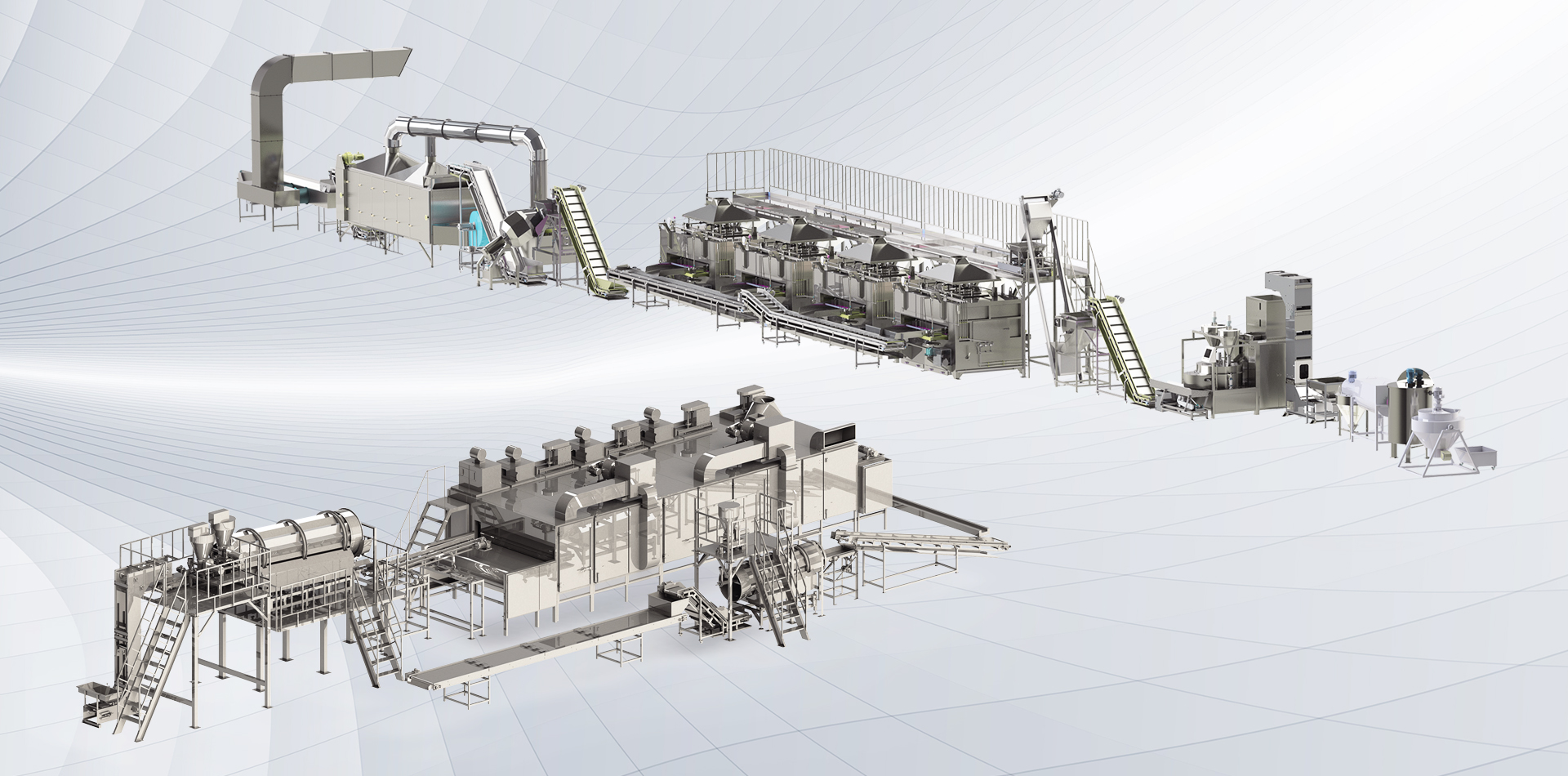 該生產線廣泛應用于花生、青豆、夏果、腰果等堅果仁裹衣烘烤加工。自動化生產,連續(xù)進出,真正實現一人多機,一鍵式操作,減少了人工強度及技術依賴性,保證產品質量穩(wěn)定性。